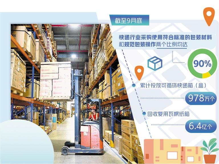早在2021年4月,国家邮政局办公室印发《邮件快件过度包装和随意包装专项治理方案》,明确集中利用1年时间,组织全行业开展快递包装绿色专项治理。截至今年9月底,全行业采购使用符合标准的包装材料和规范包装操作两个比例均达到90%,累计投放可循环快递箱(盒)978万个,在邮政快递营业揽投网点布设回收装置12.2万个,回收复用瓦楞纸箱6.4亿个。